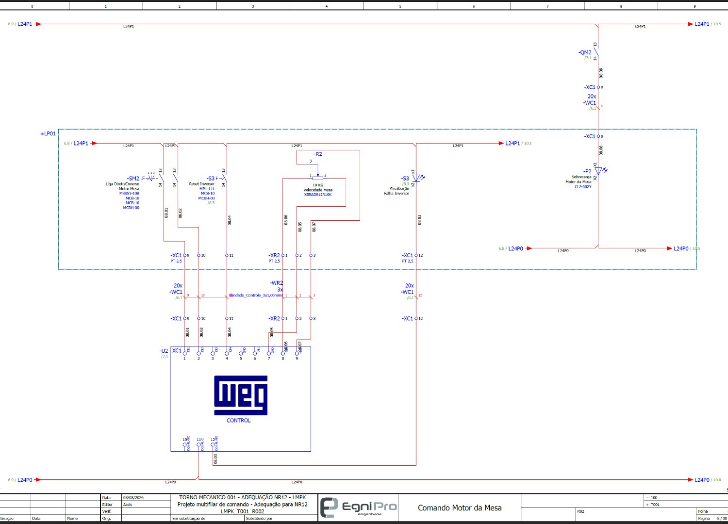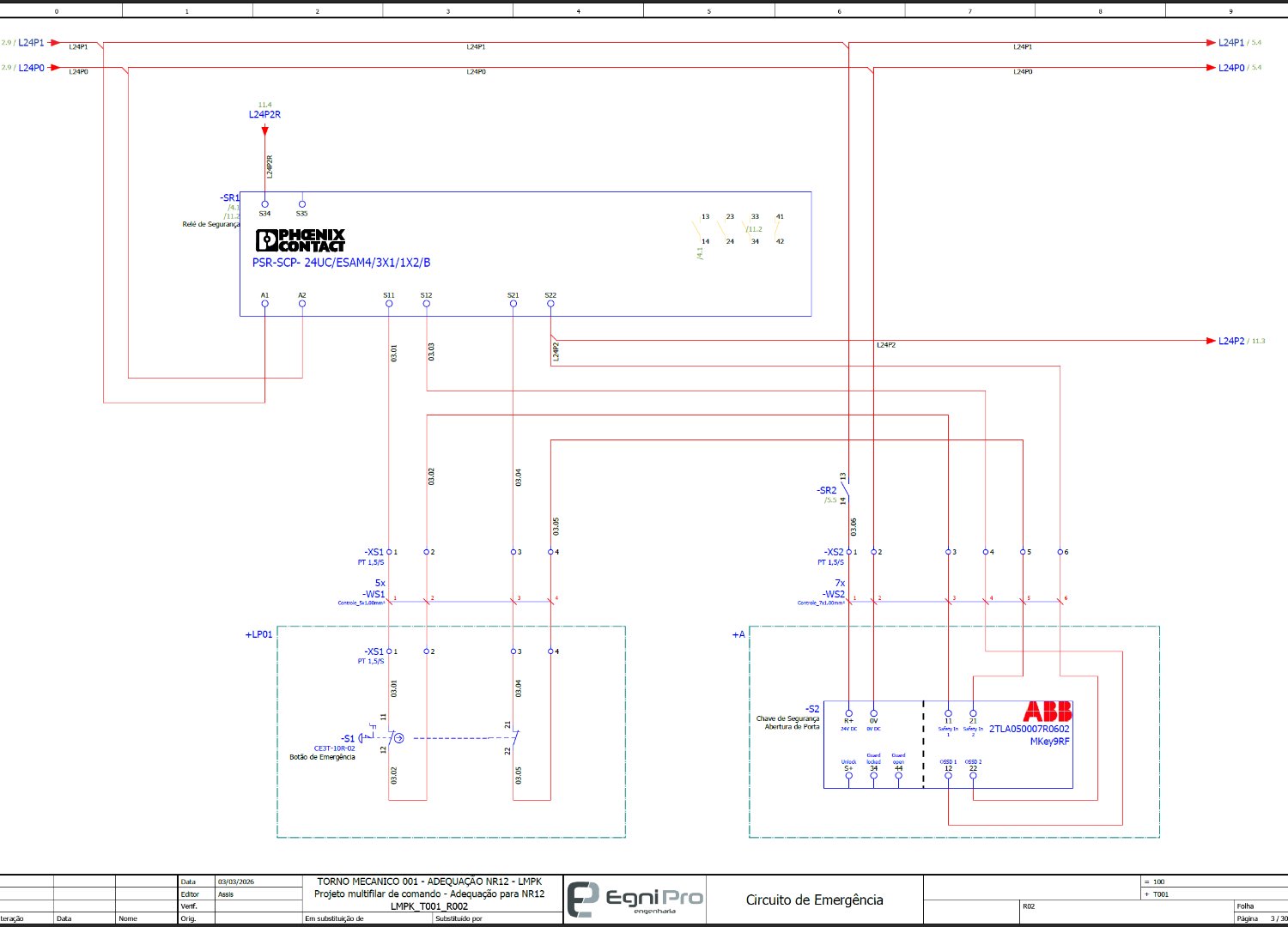 A Egni Pro Engenharia realiza um diagnóstico completo das instalações e equipamentos, identificando não conformidades técnicas e de segurança, e desenvolvendo projetos de adequação elétrica, painéis de comando, circuitos seguros em 24 V, dispositivos de bloqueio e seccionamento, sistemas de proteção e documentação técnica exigida pelas normas.